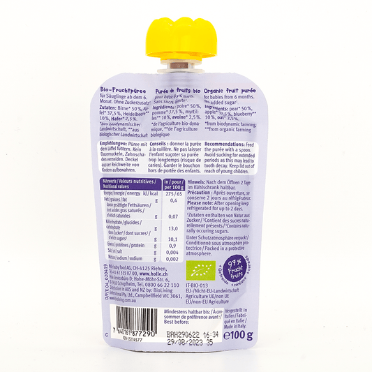 Holle Blue Bird : Poire, pomme et myrtilles avec avoine (6 mois et plus) - 6 sachets