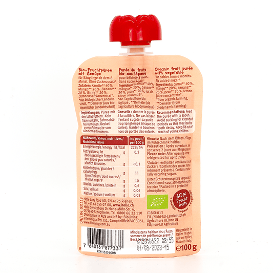 Holle Carrot Cat : Carotte, Mangue, Banane et Poire (6+ mois) - 6 sachets