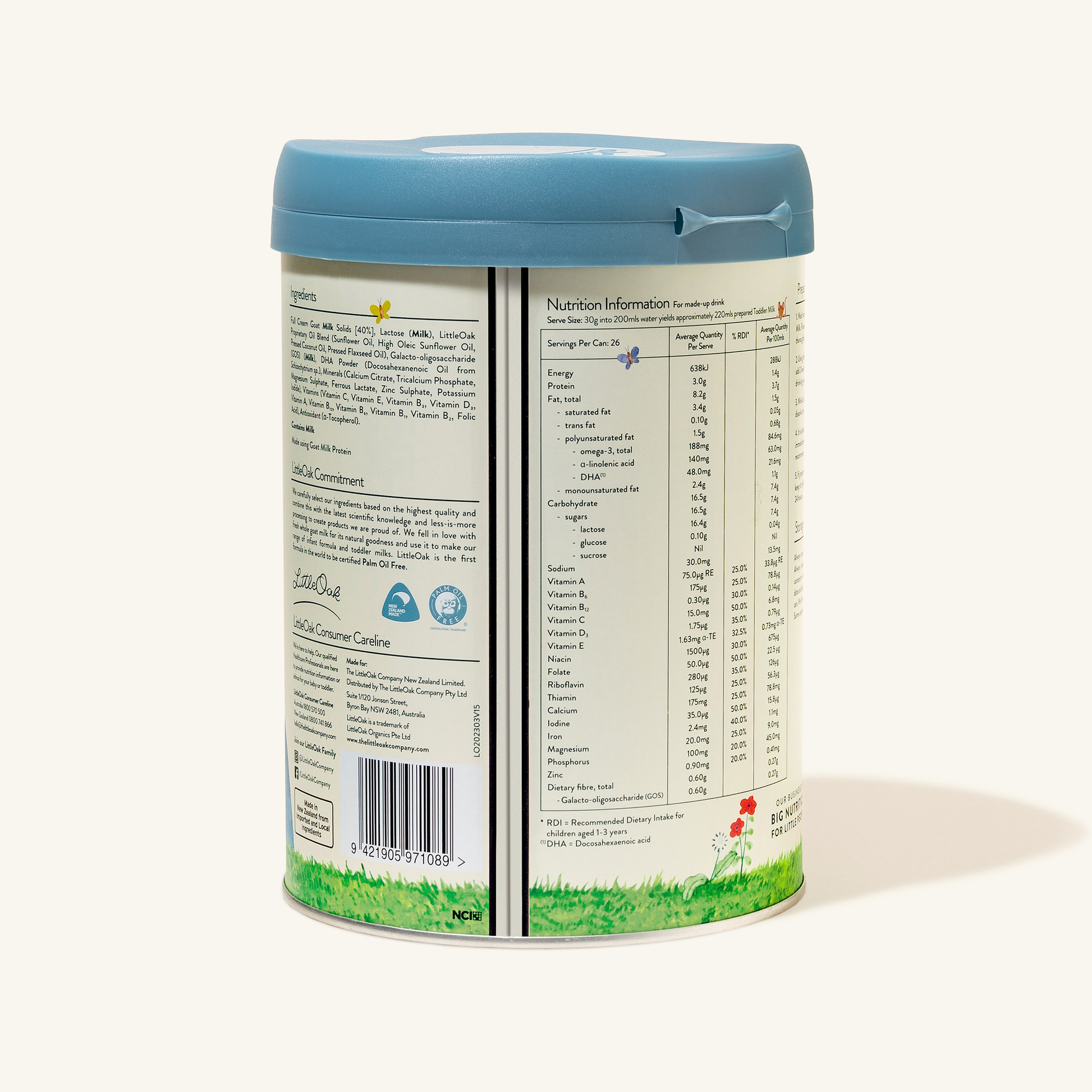 LittleOak Natural Goat Milk Toddler Milk provides the essential nutrients needed for healthy growth and development. Specially fortified with 16 essential vitamins and minerals—including protein, iron, magnesium and potassium—it is made from fresh, whole goat’s milk from our grass-fed goats at our New Zealand farm.